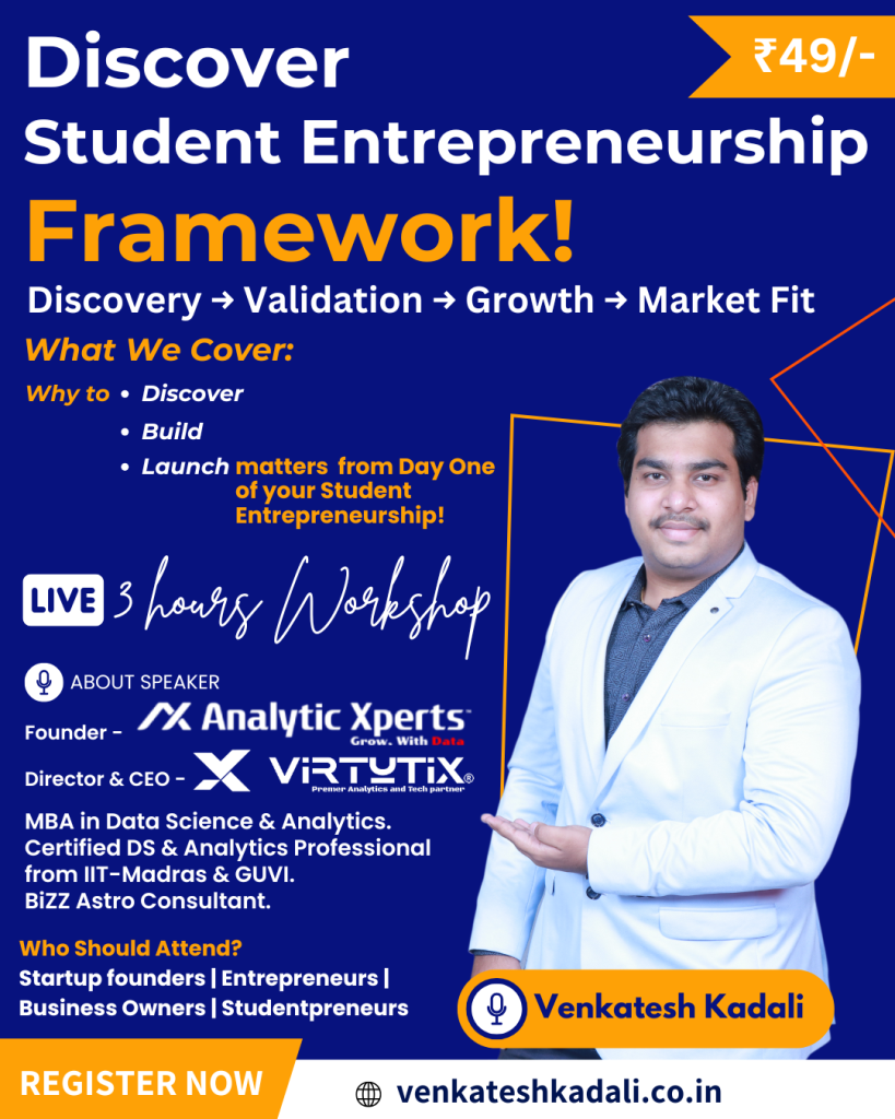 Venkatesh Kadali, Director & CEO of Virtutix IT, and Founder of AnalyticXperts and V Group Business Networks, started his entrepreneurship training and coaching journey with a powerful vision — to nurture the next generation of student entrepreneurs.